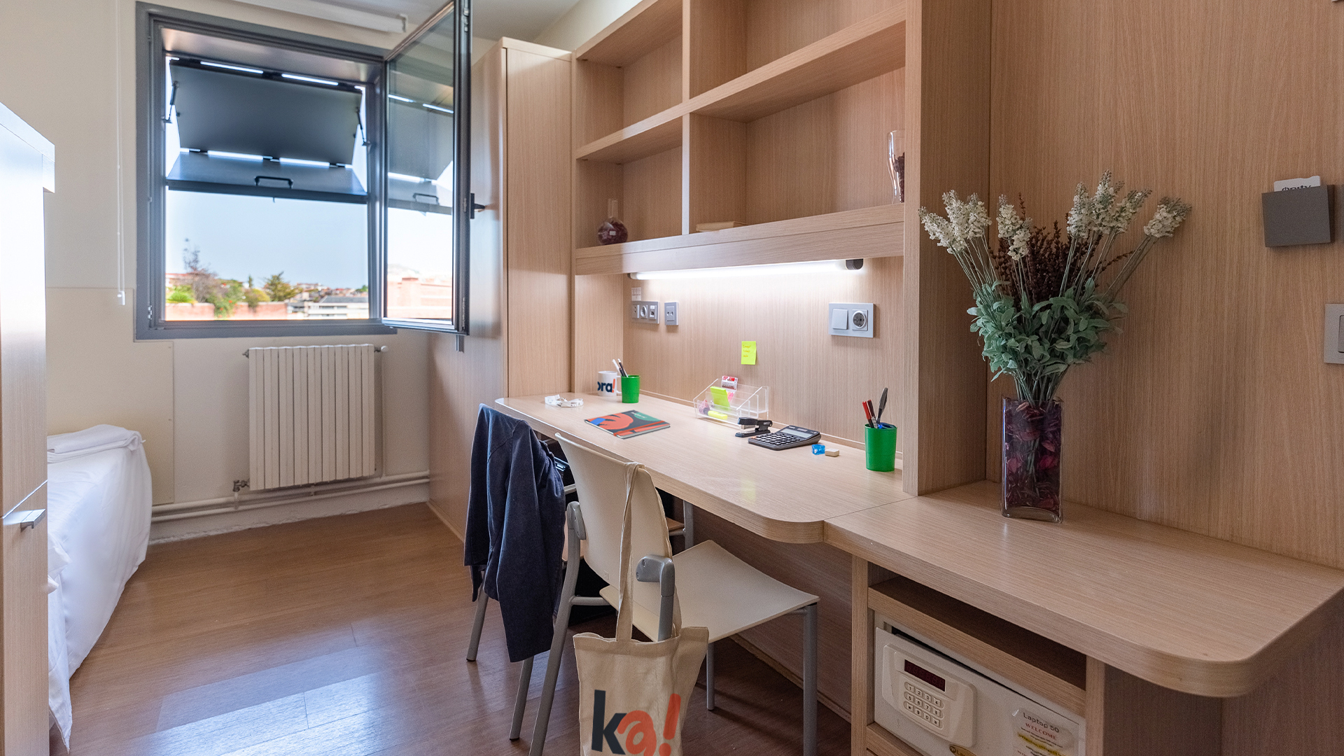 Vive la experiencia Kadora al máximo eligiendo una de nuestras habitaciones individuales en-suite en las que disfrutarás de cuarto de baño privado, espacio de estudio equipado con escritorio y silla ergonómica, una cama grande y más.