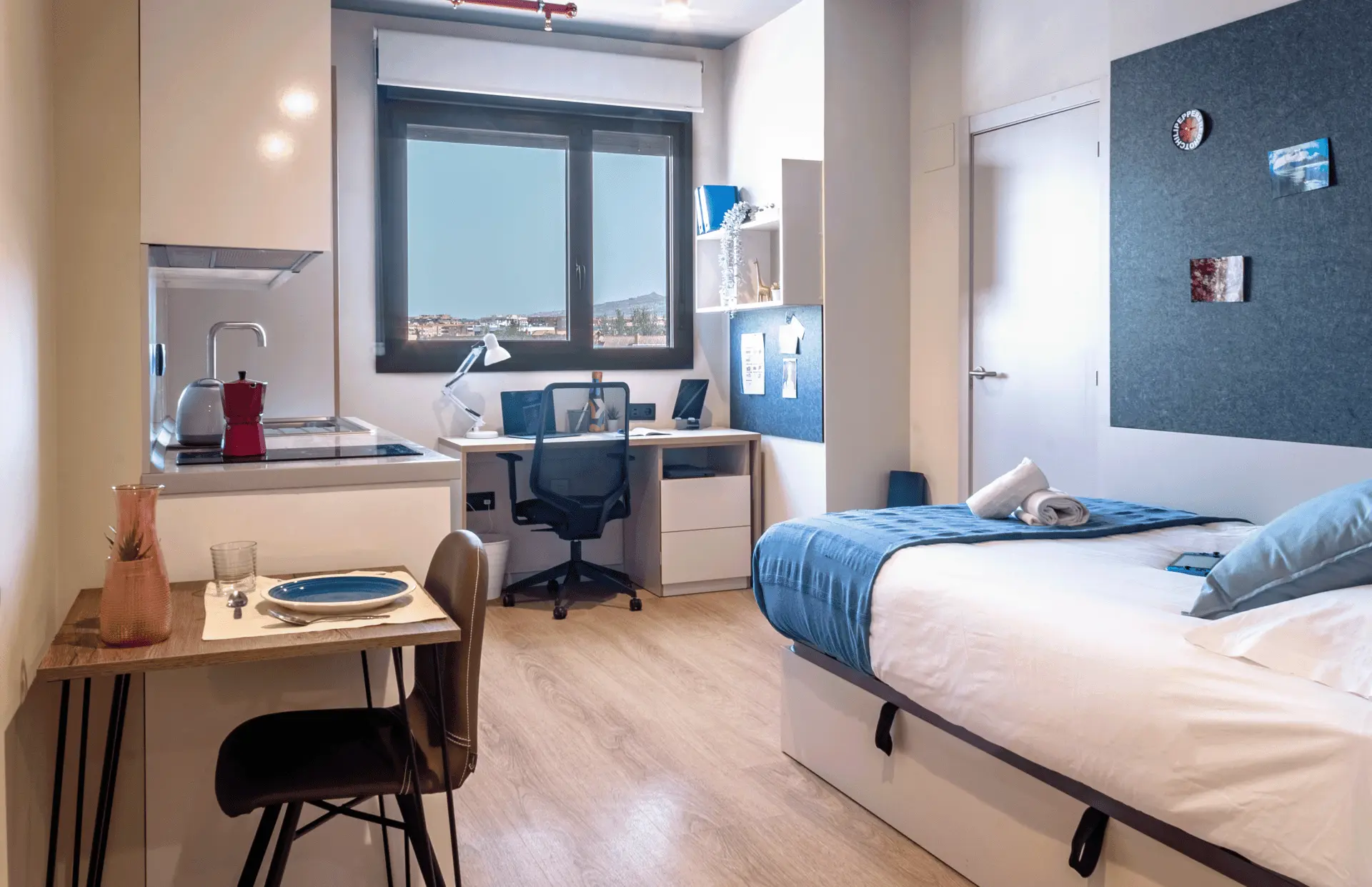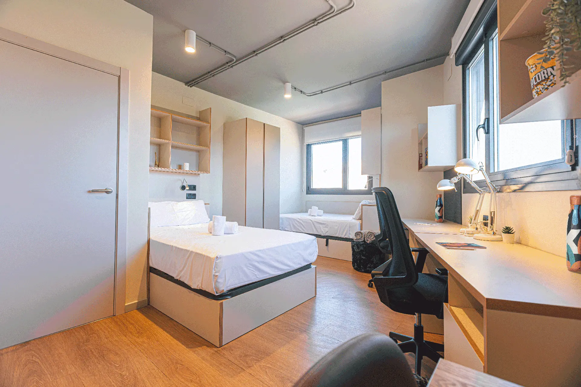 Si estás buscando compartir, nuestro estudio doble es tu mejor opción. Es un alojamiento diseñado para dos residentes, así que incluso puedes compartirlo con tu mejor amigo. Ambos disfrutaréis de cocina completa y un baño privado en un espacio moderno y de gran amplitud.