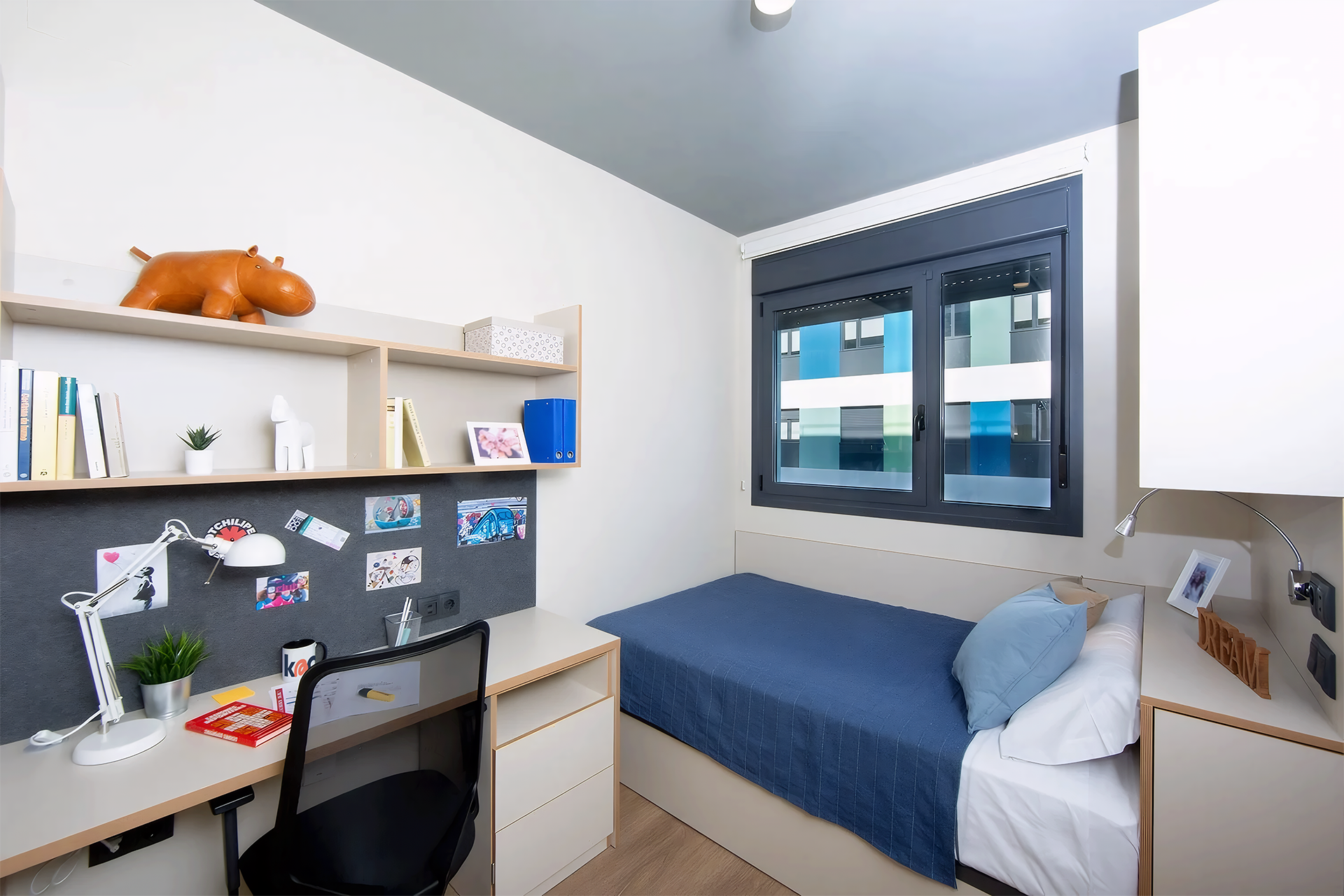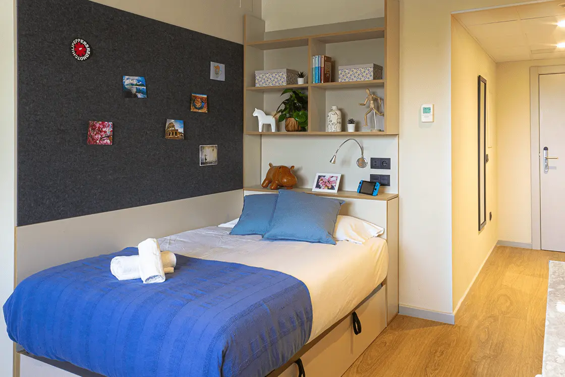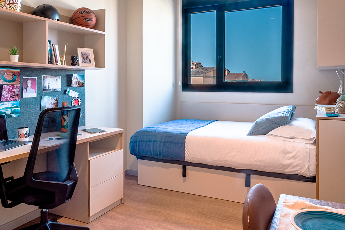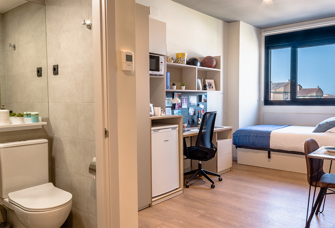 El estudio individual de la residencia de estudiantes es un espacio acogedor y privado que te permite tener tu propia cocina y baño privado, con una zona de estudio con escritorio y silla ergonómica. Estas características hacen que sea ideal para aquellos que buscan un estilo de vida más tranquilo.